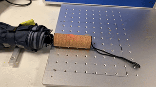 Udover branding på paraplystoffet, er det også muligt at lave laser gravering (brændt) på bagsiden af håndtaget, som vist her.